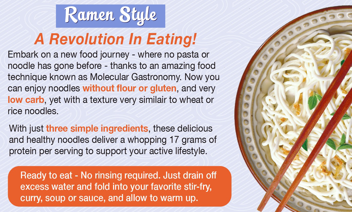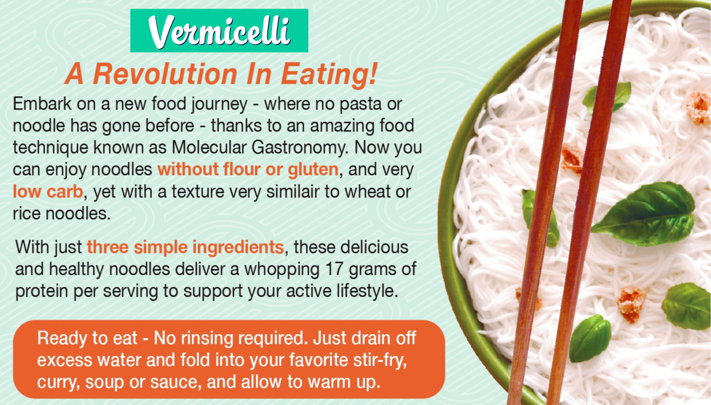 Embark on a new food journey - where no pasta or noodle has gone before - thanks to an amazing food science known as Molecular Gastronomy. Now you can enjoy noodles without flour or gluten, and virtually carb free, yet with a texture and mouth feel almost identical to wheat or rice noodles.